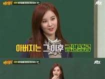 '아는형님' 소녀시대 서현(26)이 아버지의 금연 비법과 방송 최초 전 남친에 대해 언급해 화제가 되고 있다.지난 18일 방송된 JTBC '아는형님'에는 최근 솔로곡을 발표한 걸그룹 소녀시대 멤버 서현과 배우 이준이 출연해 엉뚱 매력을 뽐냈다. 서현은 이날 방송에서 아는형님 멤버들에게 "뮤지컬 공연을 하면서 자신 있는 것