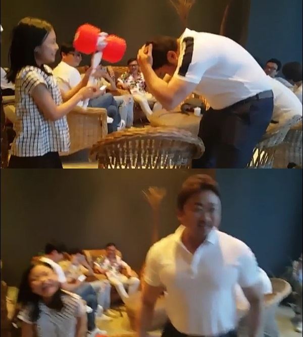 공개된 사진에는 영화 '부산행'에 함께 출연한 마동석과 김수안의 모습이 담겨 있다. 수안의 뿅망치질에 마동석이 두 손으로 머리를 감싸쥐고 있는 모습이 인상적이다.