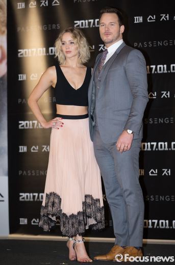 | 배우 제니퍼 로렌스(왼쪽)와 크리스 프랫이 16일 오후 서울 영등포 CGV에서 영화 '패신저스' 내한 기자간담회에 참석해 포즈를 취하고 있다.<사진=포커스 제공> |